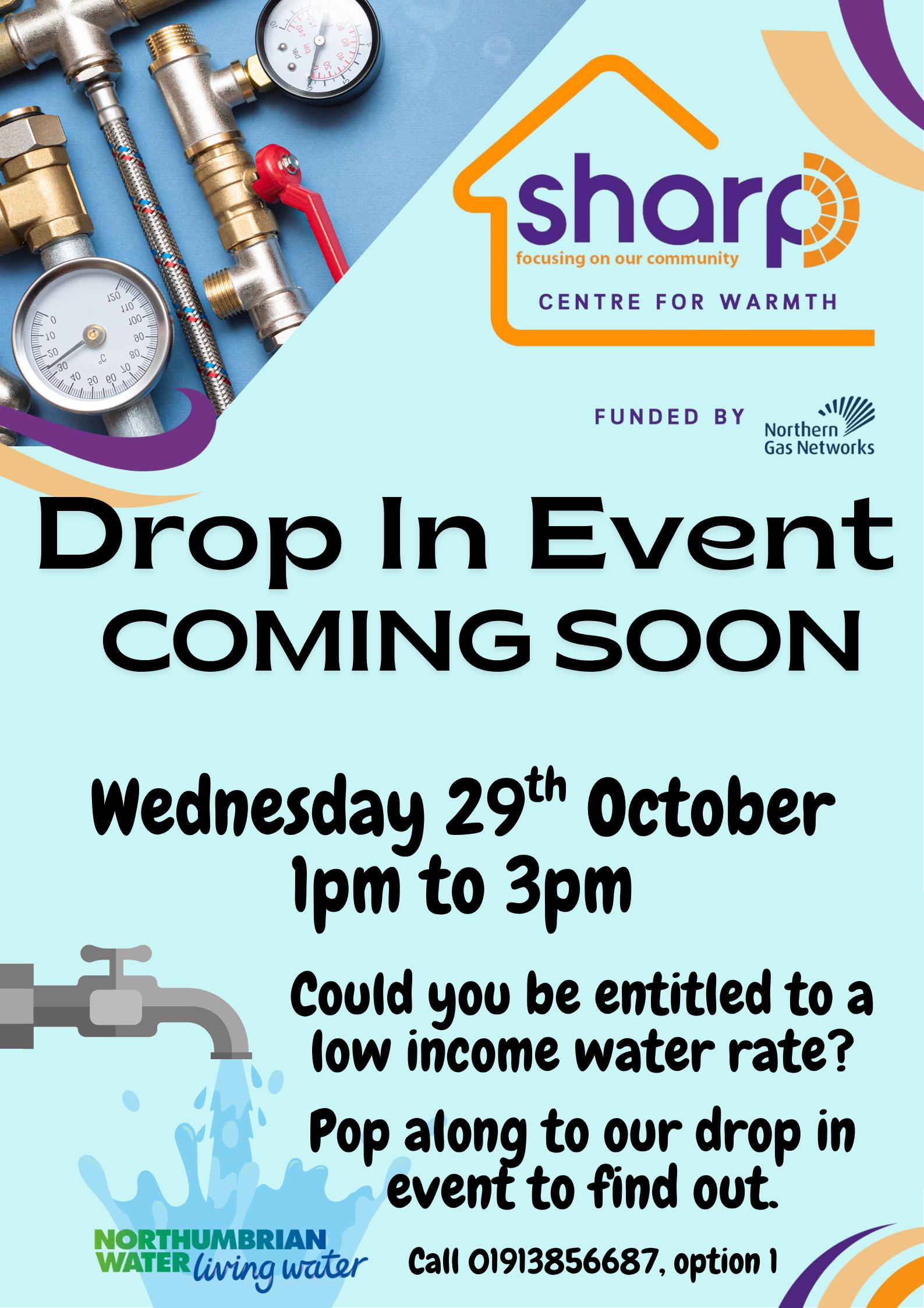 On Wednesday 29th October we will be running a drop in to check if you could be entitled to a lower water rate, if you meet the criteria our Centre for Warmth advisors here at ShARP Shiney Row can help you reduce your water payments.